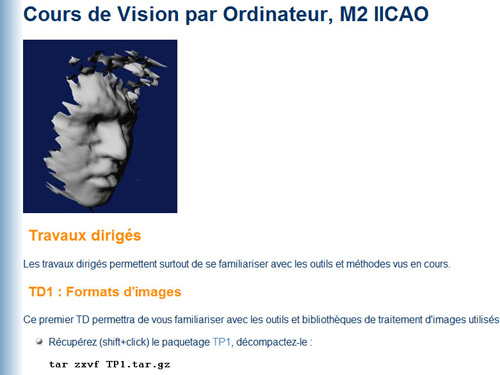 L'objectif de ce cours est d'offrir des connaissances de base en vision par ordinateur, allant du traitement d'images 2D à la vision tridimensionnelle. Les techniques vues en cours permettront de réaliser des prototypes simples à partir d'outils facilement disponibles (scanner à plat, webcam, appareil photo numérique), et de comprendre le fonctionnement d'applications plus complexes, par exemple dans les domaines de l'imagerie médicale ou de la robotique. À chaque séance seront présentées des applications concrètes, éventuellement sous forme de démonstration, des concepts vus en cours et de leurs applications.